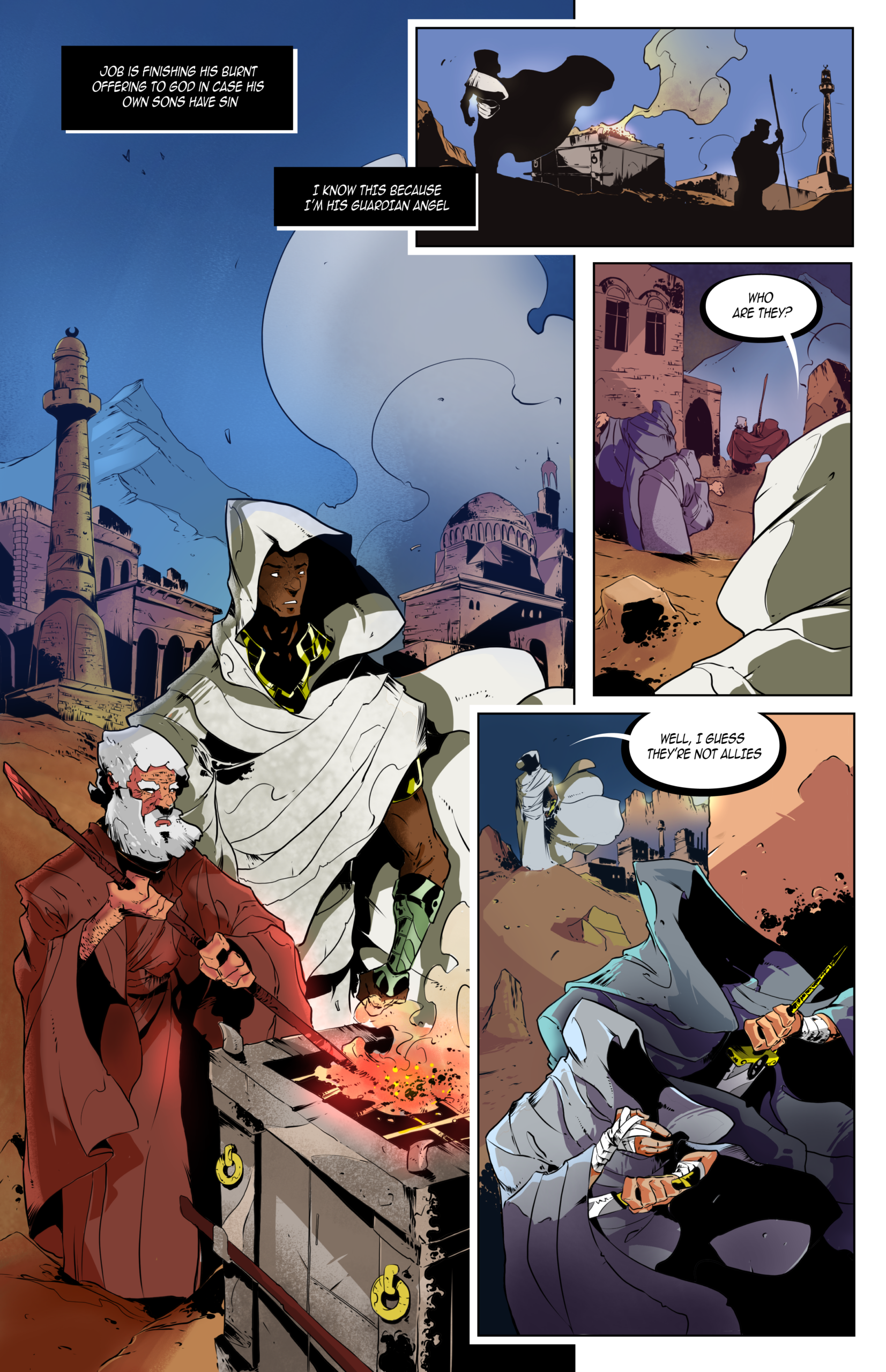 Writer: Terrio Jenkins Artist: Alejandro Samada Colorist: Alejandro Samada Letterer: Nikki Powers Our guaridan angel protagonist, Sobek, is watching over Job.